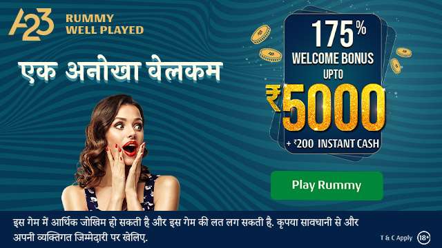 Rs.5000 + Rs.200 इंस्टैंट कैश वेलकम बोनस के साथ खेलें A23 पर Online Rummy और टूर्नामेंट में बड़ा पुरस्कार जीतने का पाएं मौका